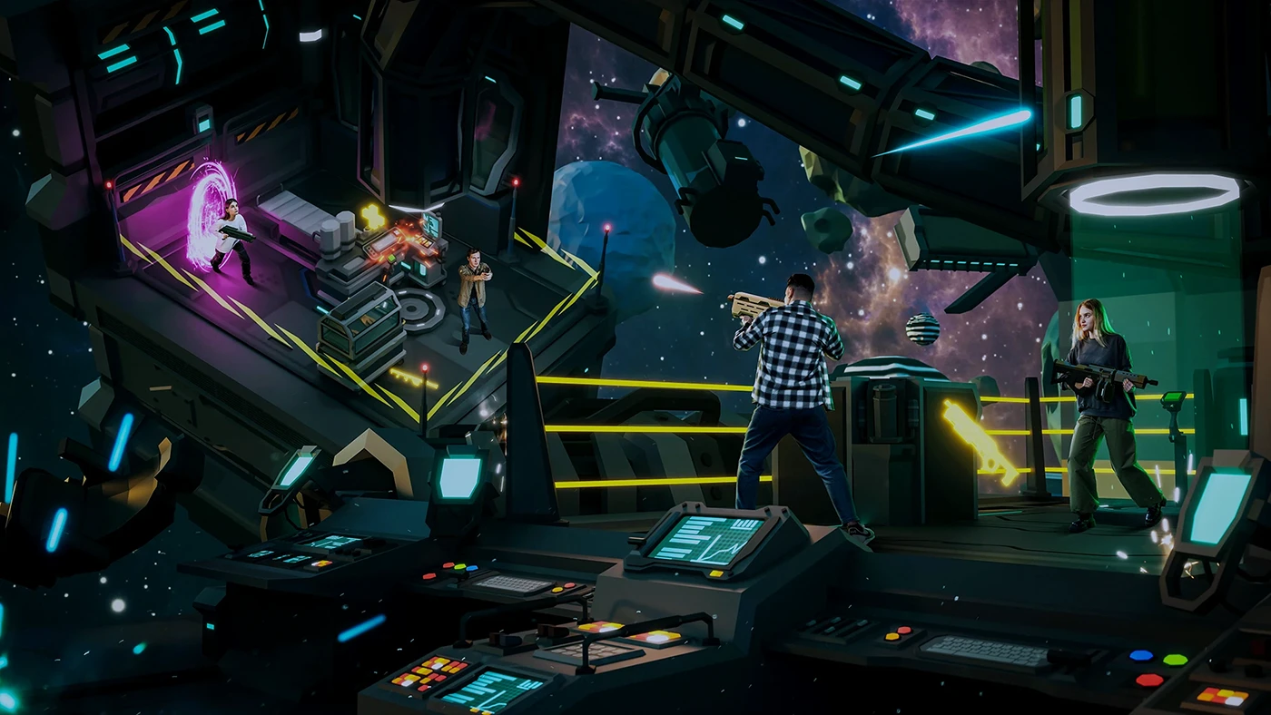 Окунись в мир космических баталий! У тебя появилась возможность доказать кто самый ловкий и меткий в космическом пространстве. Сражайся против друзей в режиме «команда на команду», улучшай навыки стрельбы и реакции, собирай бонусы!